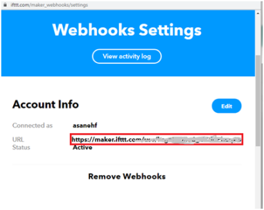 ** برای بدست آوردن لینک IFTTT API می توانید بر روی Get my IFTTT URL کلیک نمایید . از صفحه باز شده در IFTTT قسمت مشخص شده با رنگ قرمز در تصویر را کپی کرده و در قسمت url کپی نمایید این لینک برای هر اکانتی ثابت است و باید از این لینک مانند پسوورد محافظت نمایید.