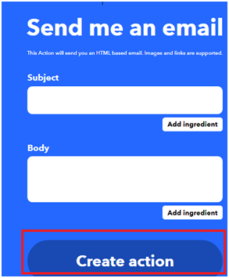 9- در این مرحله با انتخاب هر اپلتی باید تنظیمات مربوط به آن اپلت را انجام دهید . ما در این مثال باید موضوع و متن ایمیلی که به ایمیل ما قرار است فرستاده شود را تنظیم میکنیم.سپس بر روی Create action کلیک نموده و تمام.